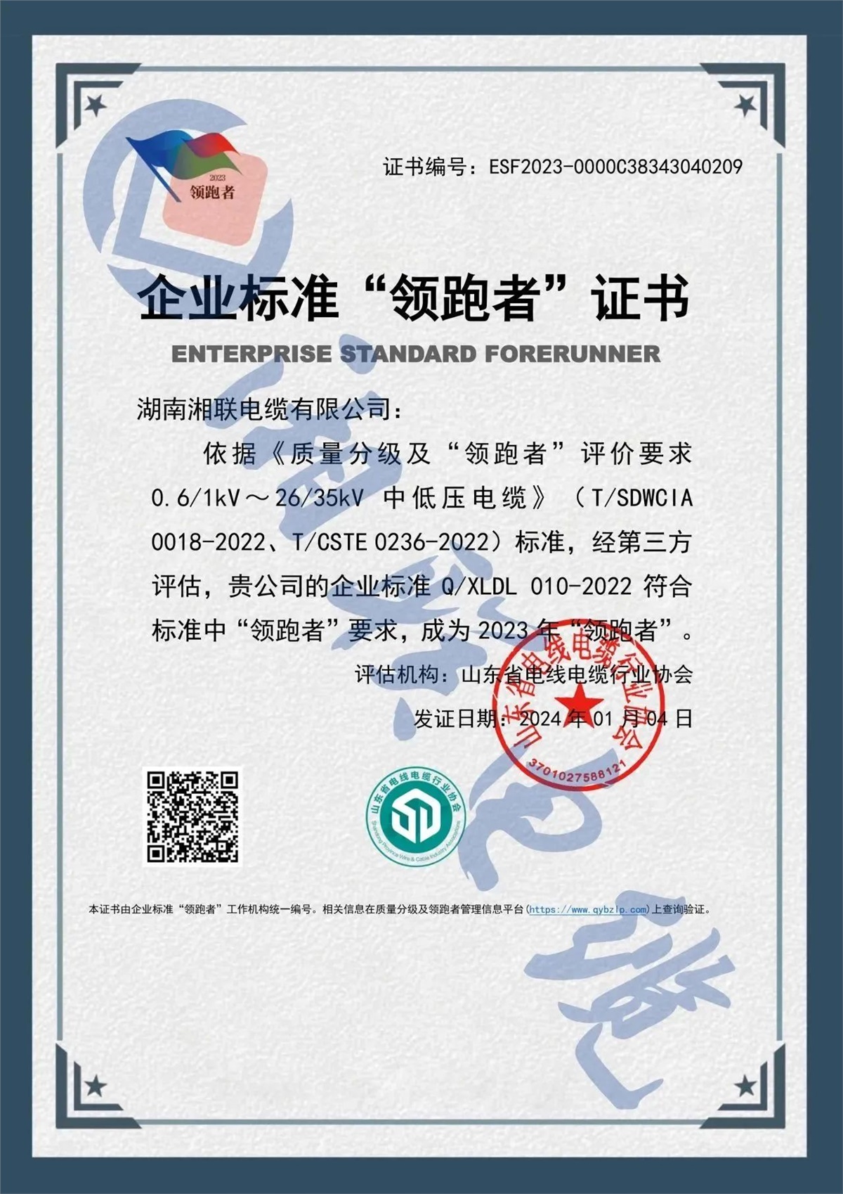 近日,企業(yè)標(biāo)準(zhǔn)領(lǐng)跑者管理信息平臺公布了2023年企業(yè)標(biāo)準(zhǔn)領(lǐng)跑者名單,湖南湘聯(lián)電纜有限公司憑借企業(yè)標(biāo)準(zhǔn)Q/XLDL 010-2022,成為2023年企業(yè)標(biāo)準(zhǔn)“領(lǐng)跑者”,湘聯(lián)電纜連續(xù)三年獲此殊榮。
