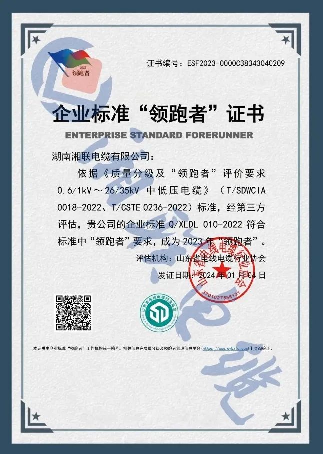 二月,企業(yè)標準領(lǐng)跑者管理信息平臺公布了2023年企業(yè)標準領(lǐng)跑者名單,湖南湘聯(lián)電纜有限公司憑借企業(yè)標準Q/XLDL 010-2022,成為2023年企業(yè)標準“領(lǐng)跑者”,湘聯(lián)電纜連續(xù)三年獲此殊榮。